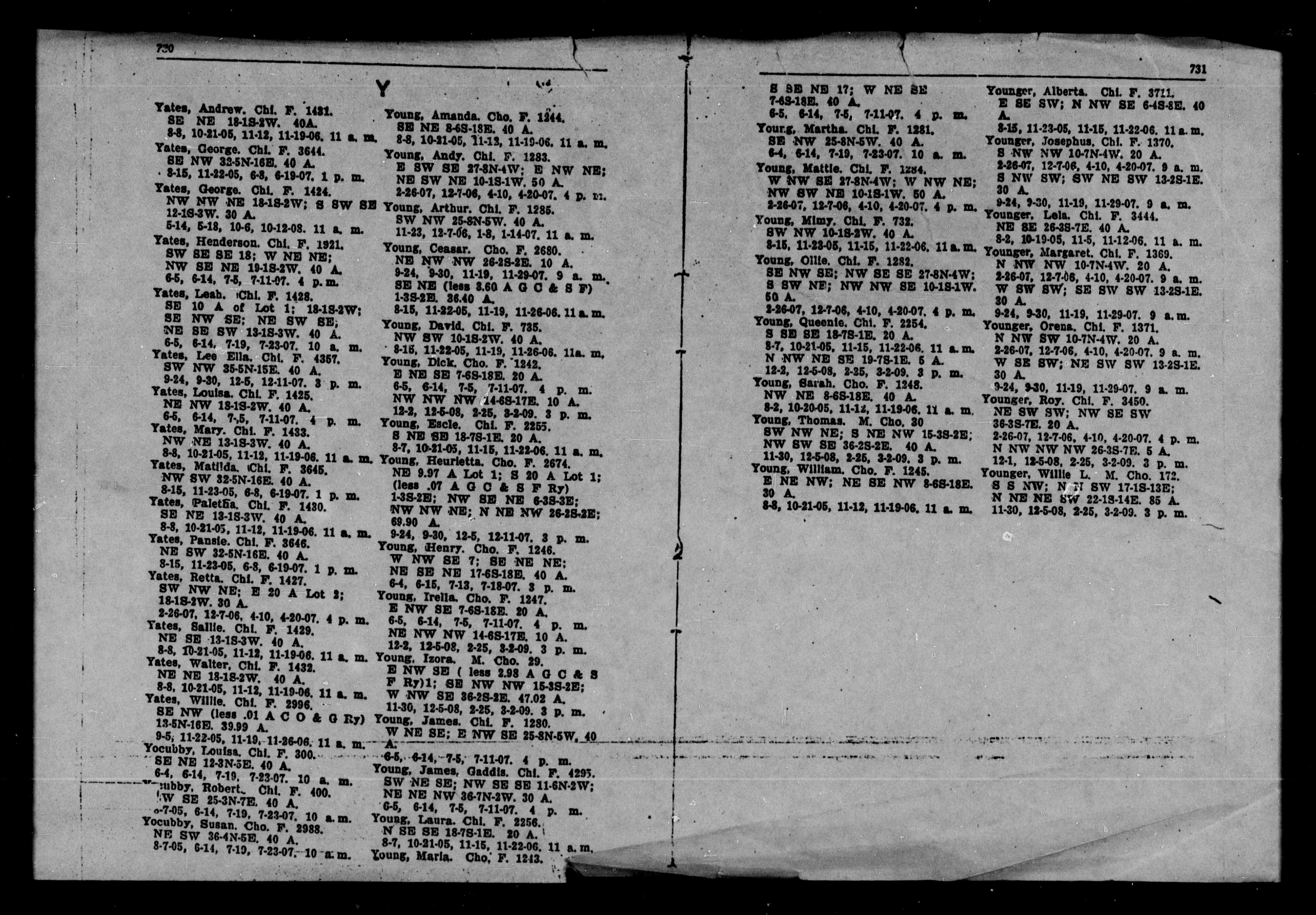 Allotments marked "Cancelled" and immediately followed by allotment to same allottee, denotes that new deed has been issued in place of deed cancelled. Allotments marked "Cancelled" and no new allotment immediately follows, denotes that allotment has been cancelled and no new deed issued. In this latter case, new deeds may be hereafter issued. Dates following description of allotments are, 1st., Date deeds signed by Choctaw Chief; 2nd., date deed signed by Chickasaw Chief; 3rd., date approved by Secretary; 4th., date filed for record, in the order name. |