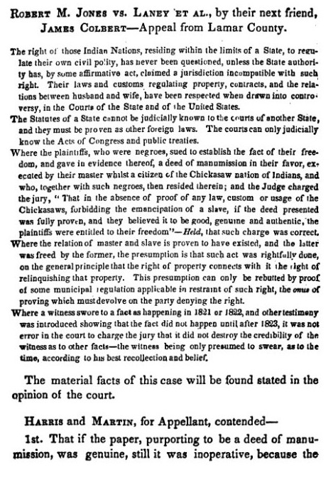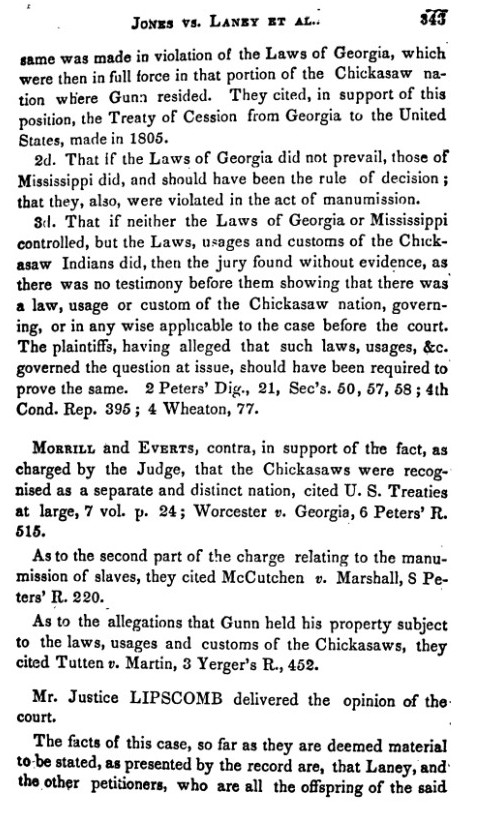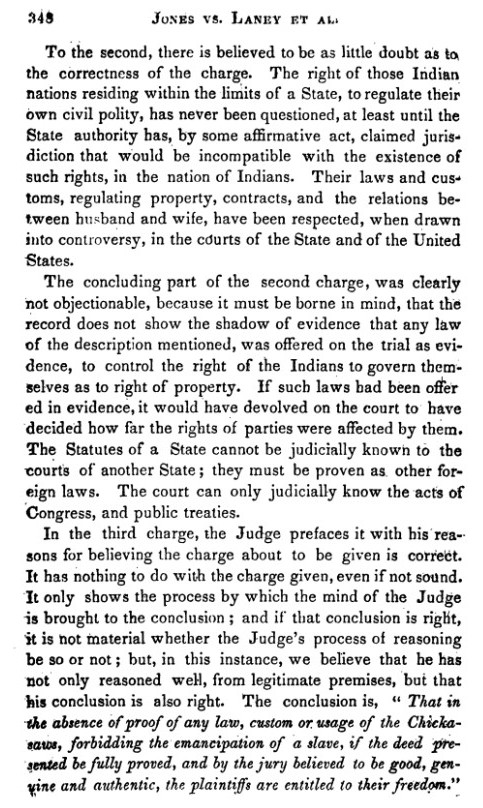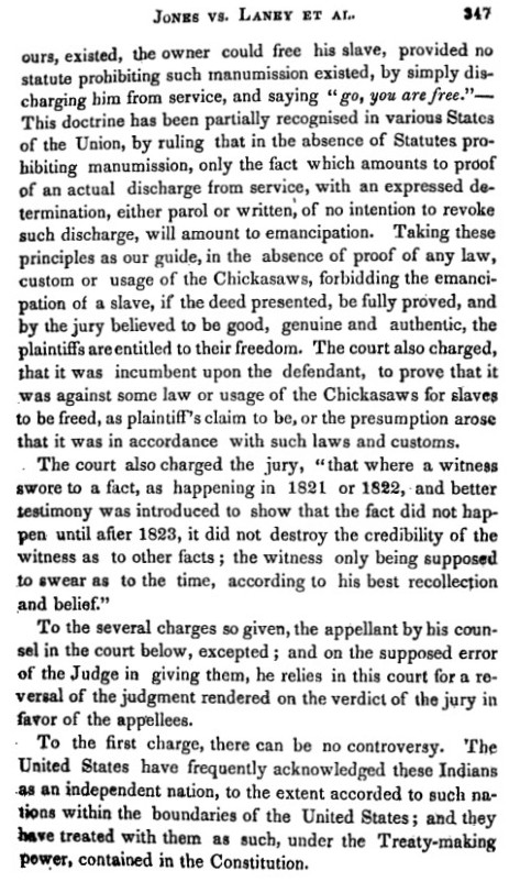 The Judge charged the jury “that by the treaty entered into by the United States and the Chickasaws in ____, the same were recognized to be a separate and distinct nation of people. That their laws and customs and usages, within the limits defined to them, governed all property belonging to any one domesticated and living with them: and that in the opinion of the court, neither the laws of Georgia, Mississippi, State or Territory, nor those of Texas, can be the rule of decision in this case. The court also charged, that by the principles of the Civil Law, under which slavery, such as ours, existed, the owner could free his slave, provided no statute prohibiting such manumission existed, by simply discharging him from service and saying “go, you are free.”, This doctrine has been partially recognized in various States of the Union, by ruling that in the absence of Statutes prohibiting manumission, only the fact which amounts to proof of an actual discharge from service, with an expressed determination, either parol or written, of no intention to revoke such discharge, will amount to emancipation. Taking these principles as our guide, in the absence of proof of any law, custom or usage of the Chickasaws, forbidding the emancipation of a slave, if the deed presented be fully proved, and by the jury believed to be good, genuine and authentic, the plaintiffs are entitled to their freedom. The court also charged that it was incumbent upon the defendant, to prove that it was against some law or usage of the Chickasaws for slaves to be freed, as plaintiffs claim to be, or the presumption arose that it was in accordance with such laws and customs.