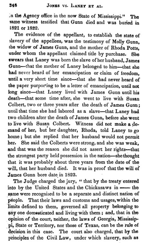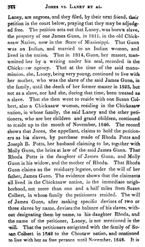 The petition sets out that Laney was born a slave, the property of one James Gunn, in 1811, in the old Chickasaw nation, now in the state of Mississippi. That Gunn was an Indian and married to an Indian woman, and lived in the nation. That in 1814, Gunn, her master, manumitted her by a writing under his seal, recorded in the Chickasaw agency. That at the time of the said manumission, she, Laney, being very young, continued to live with her mother, who was the slave of the said James Gunn, in the family, until the death of her former master in 1823, but not as a slave, nor had she during that time been treated as a slave. That she then went to reside with one Susan Colbert, also a Chickasaw woman residing in the Chickasaw nation, in whose family the said Laney and the other petitioners, who are her children and grandchildren, continued to reside up to the month of November, 1846. The record shows that Jones, the appellant, claims to hold the petitioners as his slaves by purchase made of Rhoda Potts and Joseph B. Potts, her husband claiming to be, together with Molly Gunn, the heirs at law of the said James Gunn. That Rhoda Potts is the daughter of James Gunn, and Molly Gunn is his widow, and the mother of Rhoda. That Rhoda Gunn claims as the residuary legatee, under the will of her father, James Gunn. The evidence shows that the claimants all lived in the Chickasaw nation, in the immediate neighborhood, not more than one and a half miles from Susan Colbert, in whose family the petitioners resided. The will of James Gunn, after making specific devises of two or three slaves by name, devises the balance of his slaves, without designating them by name, to his daughter Rhoda, and the name of the petitioner, Laney, is not mentioned in the will. That the petitioners emigrated with the family of Susan Colbert in 1842 to the Choctaw nation, and continued to live with her as free persons until November, 1846. It is shown that the appellant, Jones, is of Indian descent and lived in the Choctaw nation. The writing under which the appellees claim their freedom is as follows, i. e. “Chickasaw Agency, 28th of January, 1814. To all who shall see these presents Greeting: