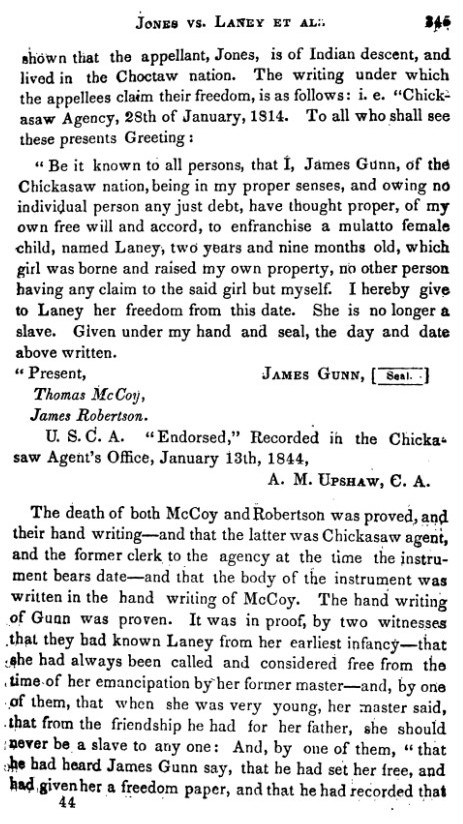 “Be it known to all persons, that I, James Gunn, of the Chickasaw nation, being in my proper senses, and owing no individual person any just debt, have thought proper, of my own free will and accord, to enfranchise a mulatto female child named Laney, two years and nine months old, which girl was borne and raised my own property, no other person having any claim to the said girl but myself. I hereby give to Laney her freedom from this date. She is no longer a slave. Given under my hand and seal, the day and date above written. “Present, JAMES GUNN. [Seal.]”