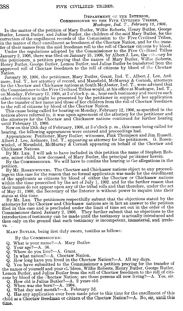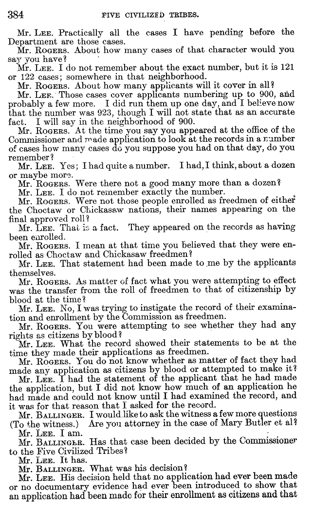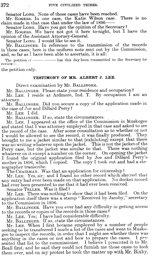 This document contains the testimony of Albert LEE, an attorney, who was hired by various Freedmen who were trying to get therir names transferred from the freedmen rolls to the citizens by blood roll. I have included an excerpt of the document pertaining, for the most part, to the descendants of Lana STEVENSON. This document is important for it's historical and genealogical significance.]