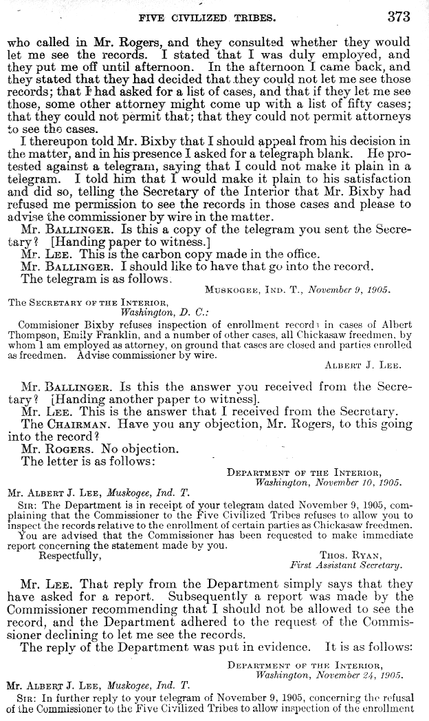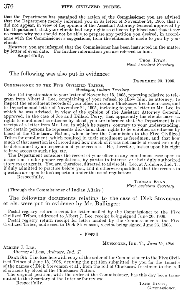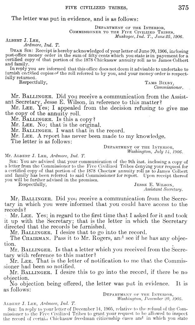 Washington, July 14, 1906Mr. Albert J. LEE, Ardmore, Ind. T
