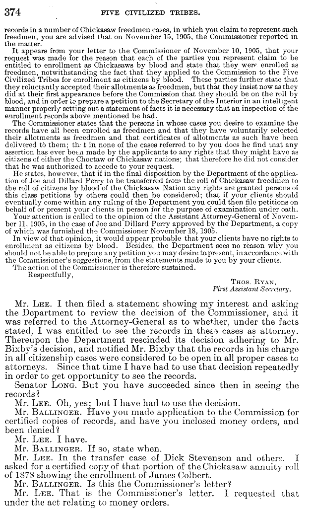Muskogee, Ind. T.SIR: Calling attention to your letter of November 15, 1902, reporting relative to telegram form Albert J. LEE, complaining of your refusal to allow him, as attorney, to inspect the enrollment records of your office in certain Chickasaw freedmen cases, and to Departmental letter of November 24, 1905, enclosing to you a letter to Mr. LEE, in which he was advised, in view of the opinion of the Assistant Attorney General, approved, in the case of Joe and Dillard Perry, that apparently his clients have no lefts to enrollment as citizens by blood, you are informed that the Department is in receipt of a letter from Mr. LEE, in which he asserts, contrary to your understanding, that certain persons he represents did claim their lefts to be enrolled as citizens by blood of the Chickasaw Nation, when before the Commission to the Five Civilized Tribes for enrollment, which resulted in their enrollment as freedmen, and that how much of that assertion is of record and how much of it was not made of record can only be determined by an inspection of your records. He, therefore, insists upon his right to have access to such files, etc.