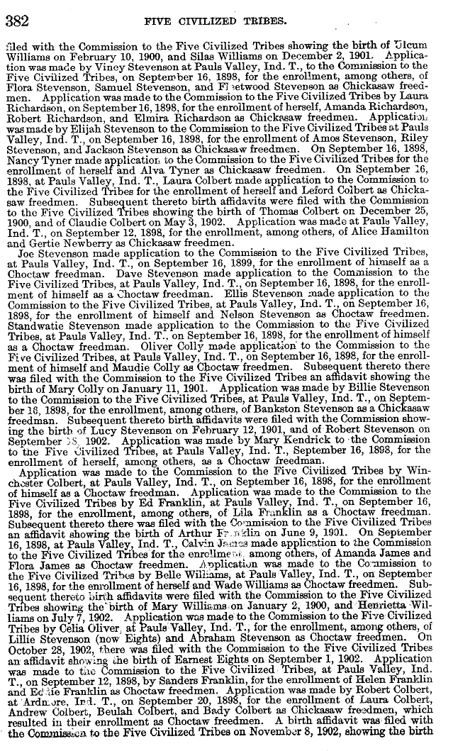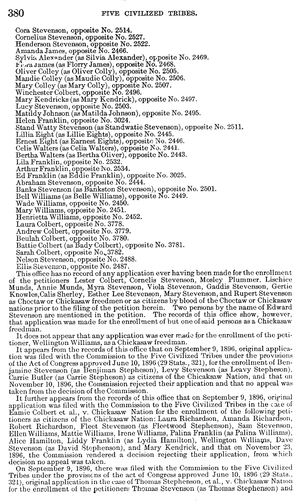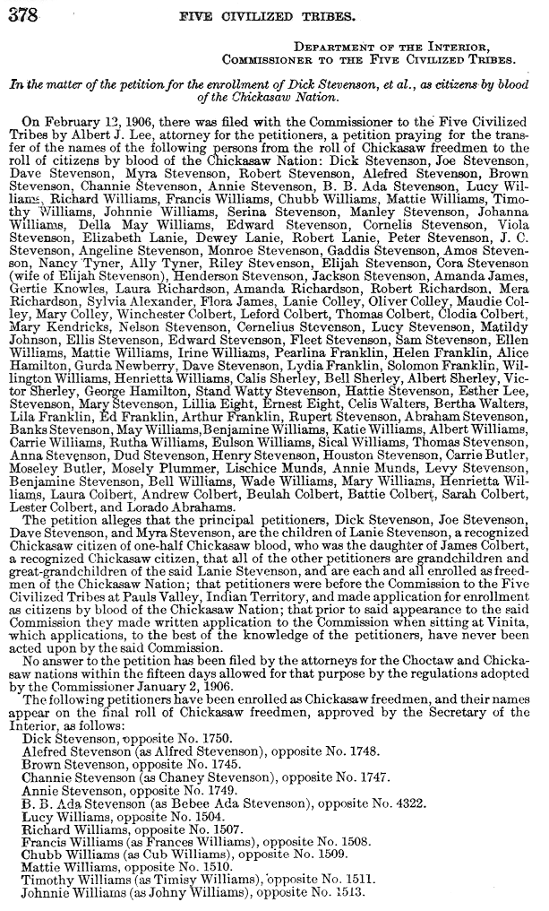 It was filed by the (living) children, grand children, and the great grand children of Laney Colbert Stevenson. This case was filed circa 1907, but references an earlier attempt (circa 1905) of Attorney Albert Lee on behalf of the STEVENSONs. This case is requesting that the names of the (living) descendants of Laney Colbert Stevenson be transferred from the Chickasaw Freedmen roll to the roll of citizens by blood of the Chickasaw Nation. These records list the names and roll numbers of Laney's (living) children, grand children and great grand children.