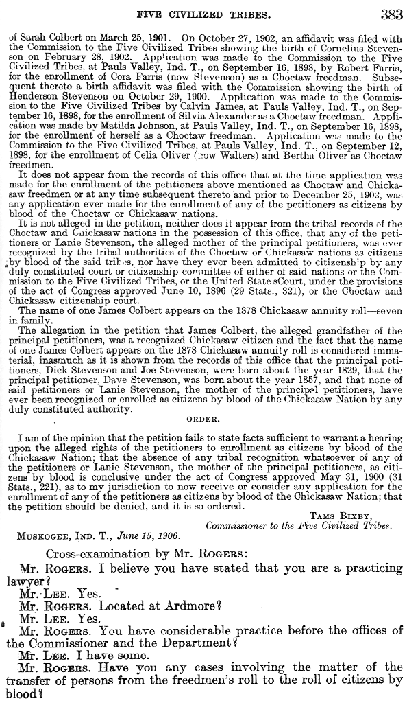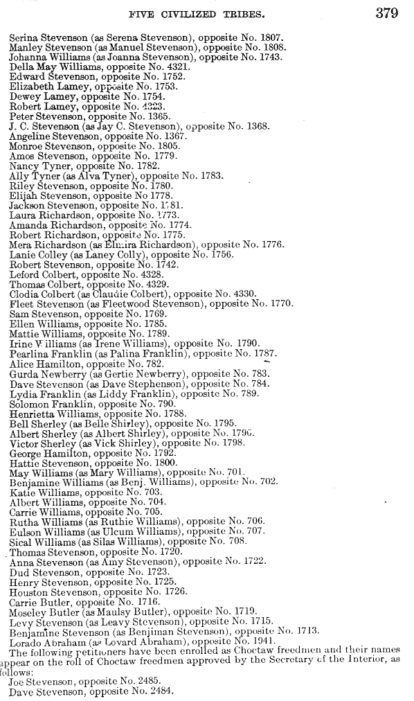 I have (yet) been unable to find any rolls that list Mobile STEVENSON or Lanie COLBERT. Lanie COLBERT's petition to get her name added to the "by blood" roll was denied, mainly because she could not establish that her name was on any of the previous "official" rolls. Mobile STEVENSON and Lanie COLBERT died before the The Final Rolls were finalized, however, their children and descendants, were enrolled as Freedmen. As late as 1906, the children and grand children of Lanie were still fighting to get their names transferred to the "by blood" roll. They hired an attorney and submitted a petition to the Commissioner to the Five Civilized Tribes, Tams BIXBY. The petition was denied.