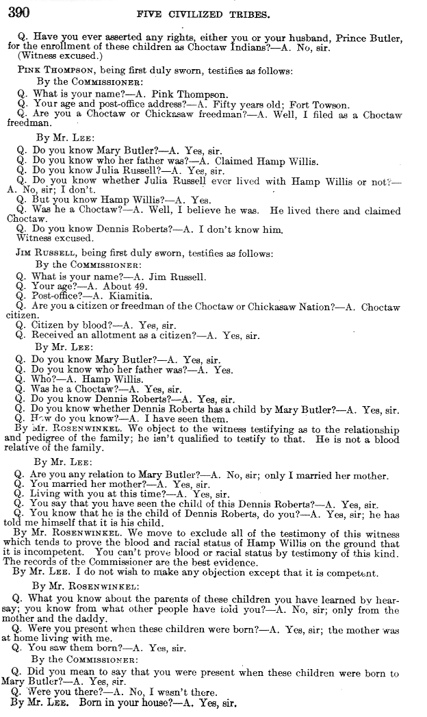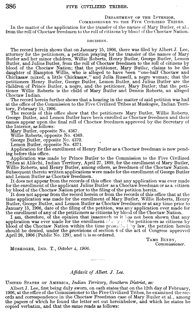 I have located the 1906 petition and the U. S. Court Case as well as other documents relating to other families (COHEEs, NEWBERRYs, LIGONs, BUTLERs, and PERRYs who also have had their citizenship claims rejected.
