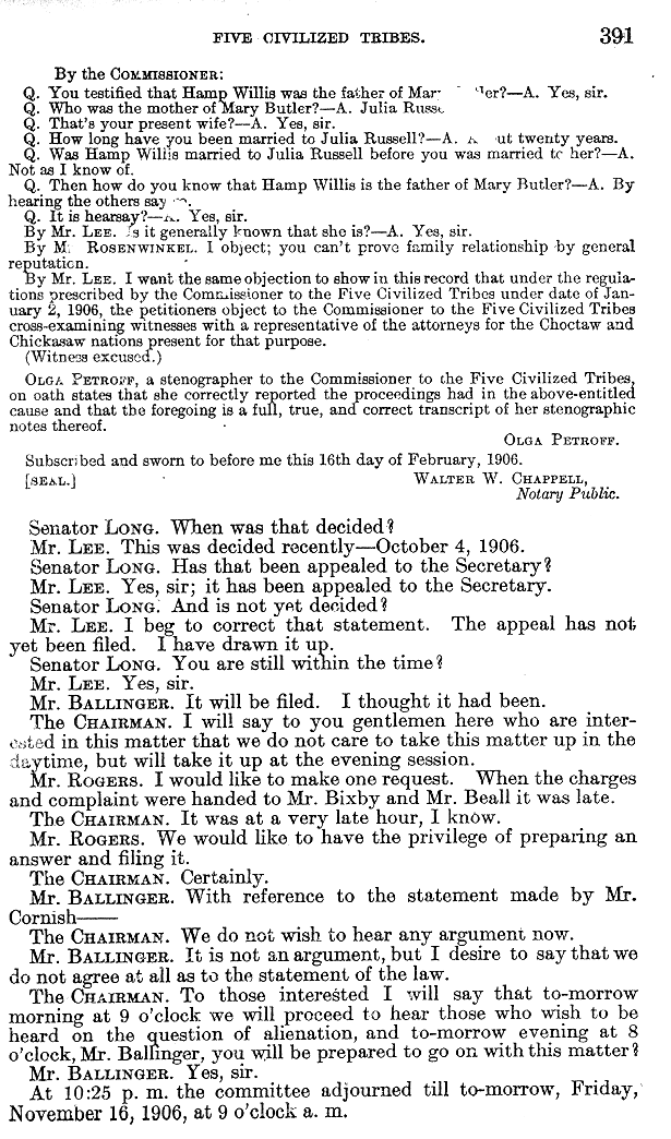 First Assistant SecretaryMr. LEE. If you will alow me to make a statement, I will give as a conrete case this NEWBERRY case that has just been quoted. A senator of the Chickasaw legislature stated under oath, and his affidavit will be offered in this case, that those NEWBERRY boys appeared at an election to vote; a question was raised as to whether they were entitled to vote, and, that certain old well-known citizens of the nation and officers of that election determined that they were entitled to vote and were citizens of the nation; and this senator goes further and states that he considered that the both of these men elected him a senator of the nation.